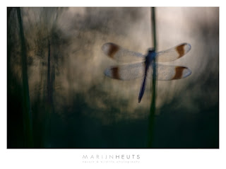 Well, actually we found way more than 40 Banded Darters (Sympetrum pedemontanum; Bandheidelibel) and I am not suggesting I even remotely resemble Ali Baba. But sometimes these blog titles just seem to come to me in a natural way and I write them down without giving them any further consideration. Maybe I should change that from now on. Still working on an image processing backlog since the iMac is up and running after a service check. Several weeks ago, I teamed up with Gerard Schouten and Jarno van Bussel at a great location for this most beautiful member of the darter family. They are a relatively scarce species in the Netherlands, but wherever they occur, they can do so in huge numbers and such was the case at this small reserve. We were not really lucky with the weather. Of course we had hoped for a cold night with a colorful sunrise, great light and dew on the darters. Non of that happened, the colors were muted, the temperature was mild and there was a stiff wind blowing. Not ideal, but we had an appointment and thus tried anyway. Because of the wind, the darters had found shelter way deeper in the vegetation than they normally would. At first it was difficult to find them, but within an hour they were flying everywhere, leaving us puzzled as to their overnight locations. The good thing about Banded Darters is their striking silhouette, with the tell-tale bands on all four wings. Images of other dragonfly species can be boring to look at when the light is not that special, but Banded Darters offer possibilities in every kind of light. In this case, I shot against the pastel color of the muted sunrise and through some dense vegetation. I manually focussed behind the darter. That way the vegetation was rendered as painterly streaks, something I could not achieve when focussing on the dragonfly. Because of the strong shape of the darter, I think this image works, even with no part of the image being sharp.