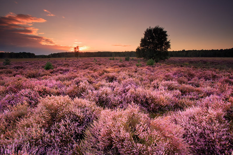 So no spectacular pink sky to match the pink/purple hues of the heather. It was good fun though and I made mental notes of promising vantage points. I went back on Saturday evening and did not even mind to forego Match of the Day for it! Again the sky looked promising after a day of hard wind and heavy downpours. But in the end, when the sun finally hit the treeline, almost all clouds had gone and the sky was featureless. Nonetheless, the pinkish light after sunset that is so hard to see with the naked eye but is perfectly recorded by the camera, stressed the beautiful colors of the heather even more. I recently learned that subject colors that match the color (or temperature, if you wish) of the ambient light will really pop in your shots. Now I can conform that is true.