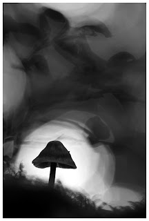 I positioned the camera so that the fungus was placed in the spotlight of a circle of light that shined through the canopy. The upper part of the frame consists of an out of focus patch of blueberry and part of the canopy. I rendered the image B&W in postprocessing, as I am of the opinion that the color takes away from the essence of this image.