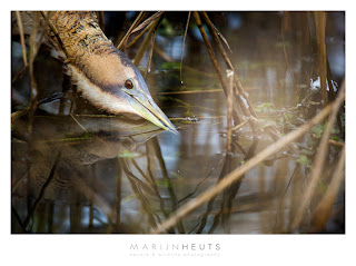 I never got there, because I suddenly saw a Bittern (Botaurus stellaris; Roerdomp) along a small stream. I spent the better part of two hours watching it perform its ‘reed act’ from the warmth of the car. At one time, I was temporarily distracted by 3 Roe Deer on the other side of the car, and when I turned my head back, it took me minutes to find the Bittern again, although it had not moved at all. Master of disguise! It never stood completely out in the open, but I like the photos I got anyway. They much better portray the secretive nature of this beautiful bird. I went back on Sunday but could not find it again, but chances are good that it was there in full hiding. I did see two Kingfishers at the only open pond in the area. Note to self: must go back with tenthide when (or if?) fresh snow falls.