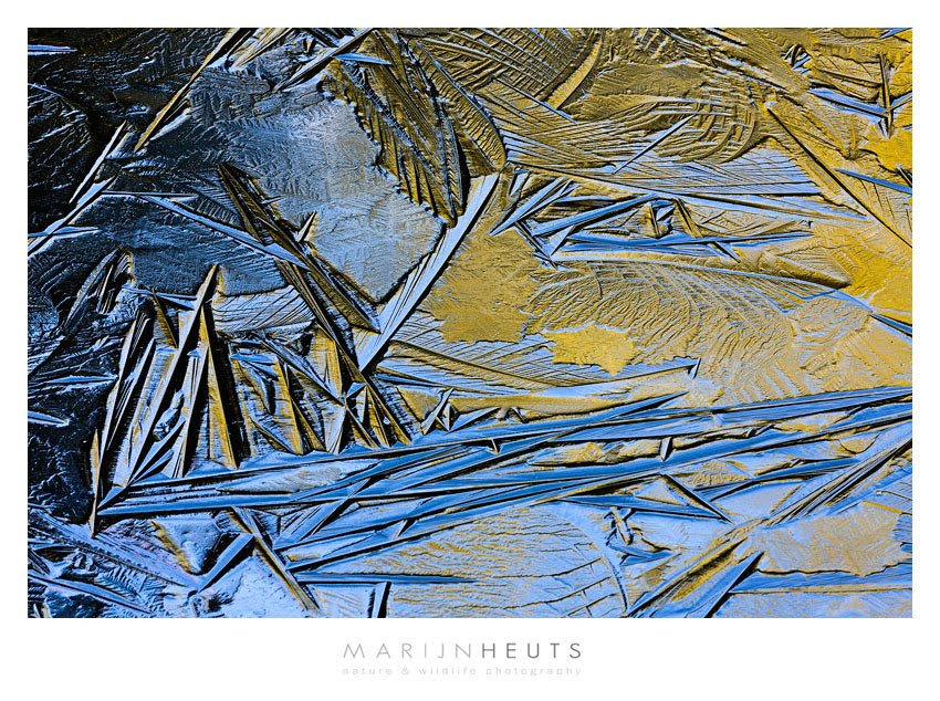 The idea was to check on a hidden mudpool in the forest that is frequently visited by Deer, Boar and Fox. I have never seen any of them at the pool, but their tracks are everywhere. I did not find any animals, but the ice on the pool immediately attracted my attention. Because of a stiff wind (and probably the movement of bathing and drinking animals), the ice had taken on all kinds of interesting shapes and forms. To top it off, the pool itself was in deep shade, but the highest trees that circumvent the pool were hit by the morning sun and the warm color reflected on a few spots on the ice. The ice was too thin to step on, so I had to shoot with a long lens from the shore, which called for use of a very small aperture to get front to back sharpness. This truly is nature’s art, what painter could think of (and execute) such colors, shapes and forms?