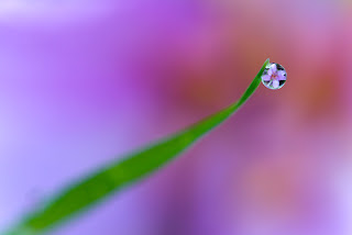 With the weather not looking very promising for landscape photography and most of the heather being way beyond looking best, I took the macro set and went to look for Meadow Saffron (Colchicum autumnale, Herfsttijloos). Like last year, I found them just two days after heavy weather, so most of the flowers were in relatively bad shape. No use in portraying a single flower, so I mounted the extension tubes and extender and went to look for close-ups. It was not before long that I found this dewdrop on a grass stem, just above a Saffron. By getting close enough, I got this abstract, simplified look with contrasting colors.