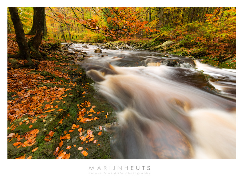After last week’s post of a few inches of Ardenne Water, here’s the broader view of one of the many picturesque forest streams in the area. It had rained the day before, and it was cloudy when we were there. Perfect for nicely saturated autumn colors without any disturbing reflections anywhere. Of course, a polarizer is the obligatory accessory in these circumstances. Funny how I managed to keep my feet dry (Wellington boots) in the fierce waters of the streams for almost two days, but got immersed up to my groin when I put one foot in what looked like an innocent mud pool but appeared to be a deadly peat hole.
