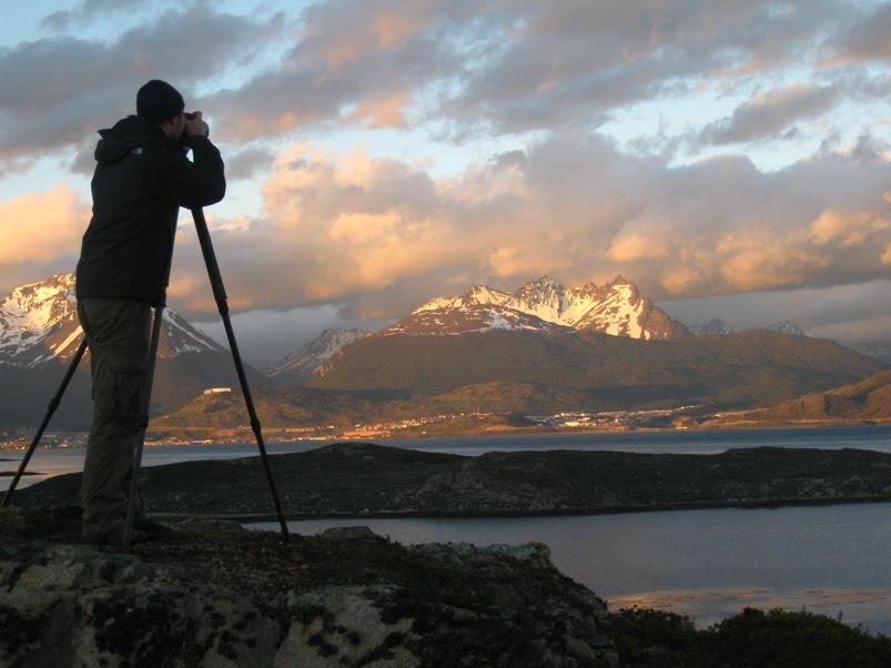 Me photographing sunset over the Beagle Channel on Tierra del Fuego; photo by Hanneke.