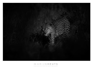 Probably the most sought after subject on a photographic safari to Africa is the majestic and elusive leopard. Because of their secretive nature and perfect camouflage, they are hard to spot (pun intended). Lurking in the dense foliage of riverine forest or the undergrowth of more open savanna, we will often be very close to them without us ever knowing. As is often said, it is only to a leopard to decide when it wants to be seen. A decent sighting of a leopard remains a special treat on any safari, and still, after several encounters, I get shivers down my spine and an unfamiliar fear of failure creeps upon me when I see on in the open. With all other subjects, I just calmly aim, focus, decide on the composition and fire away. But with leopards, I first have to control myself before controlling the camera, which greatly increases the chance of technical mistakes. I am happy to have succesfully overcome my leoparditis on most occasions, with the proof in my archives. Above is an image of a huge male, moving through the high grass on a sunny winters day. Around noon, shadows are deep and dark and the rosette pattern of the skin enables this fat cat to blend with the surroundings. We followed it for a while, losing sight of it often, only to relocate it when we saw movement in a sunlit patch somewhere further up in the field. By underexposing and converting into B&W, I was able to create this moody image.