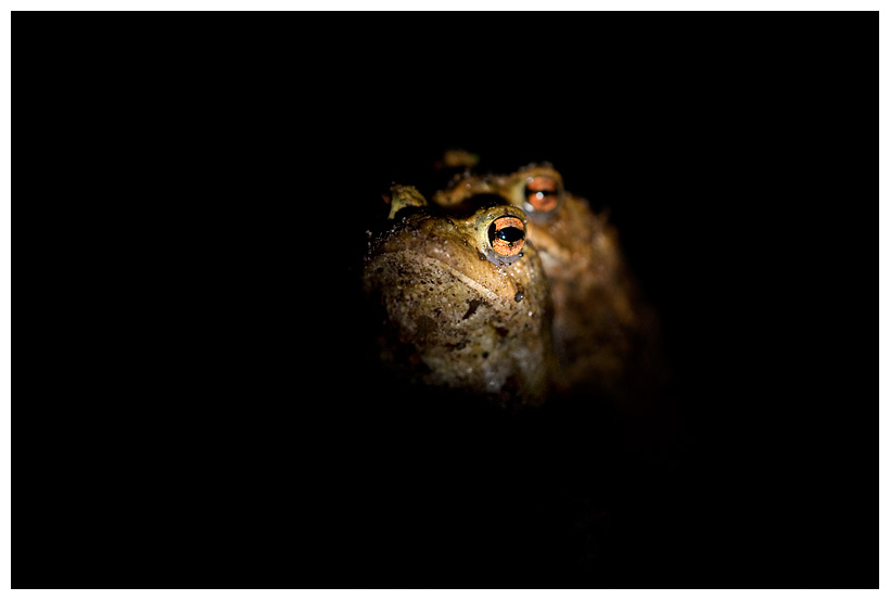 The place I usually go to photograph the Toads is a sandy forest trail. As amphibians tend to have a moist skin, sand and other forest debris sticks to it and the Toads are sometimes completely covered. Some of them look like creatures from another planet. Here’s a couple (called an amplex), lit only by a torch. I also took lots of photographs with the use of flash and some sort of a large softbox. Those shots look more as if they have been taken during daytime. I prefer the secretive, nightly look of the ones lit by the torch.