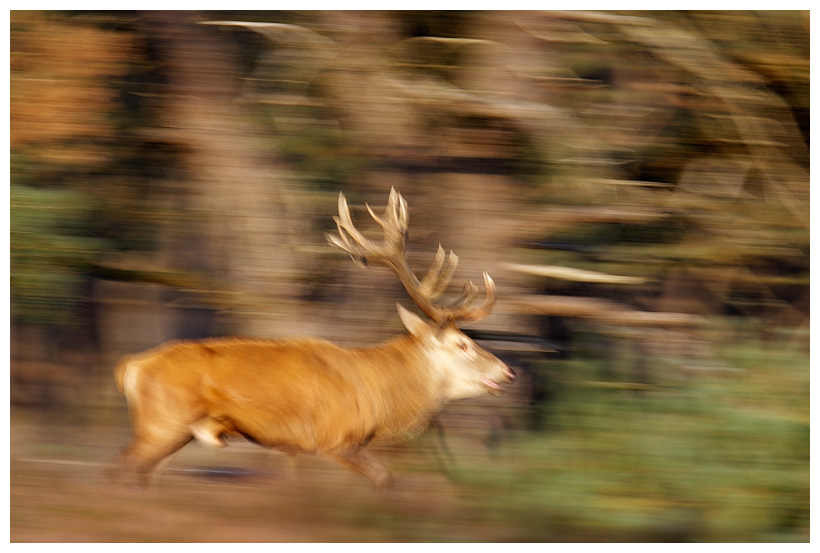 In the Netherlands, the Red Deer rut can only be witnessed in two places: the Veluwe and the Oostvaardersplassen. The latter being not very accessible and the former being on the way to our holiday address, we visited the Veluwe for an afternoon to watch the spectacle unfold. It truly was a spectacle, with several stags grunting their hearts out and gathering their harem of hinds (as seen in the panned image above).