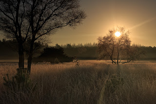 Those who regularly read my blog know about my frustration with the weather forecast and my lousy timing in that respect. Well, for a change, I got it right this weekend. Friday morning was said to be a true early winter’s morning with light frost and possibly some fog. When I got out the door, the sky was clear and I immediately got that crunchy feeling in my nose that only occurs when temperatures fall below zero. Call me moderately masochistic, but I like it! Friend and colleague Gerard Schouten joined me for the morning and when we arrived at the intended location, fog obscured the ground level and the frosty open heathland was dimly lit by an almost full moon. That made for interesting circumstances and compositions and I got some decent results.