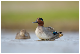 Common Teal couple; Canon 1D Mark III w. 500/4 and 1.4x; 1/640s at F5.6 and ISO400; lensfoot on ground.