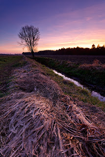 The big mistake I made was to head for a location I did not know very well because I thought the meandering stream there, combined with the wide, unobstructed view, would make for a nice subject. I arrived at the spot long before sunset, so had all the time to look for a suitable composition and setup my camera. However, right before sunrise, I found myself still rushing around because there was not a single vantage point that provided me with an image that I was hapy with. In the end, I settled for this relatively standard composition of a silhouetted tree against the evening sky. The recently mowed reeds and the ditch are nice diagonal elements and the pinkish afterglow light is pleasing to the eye.